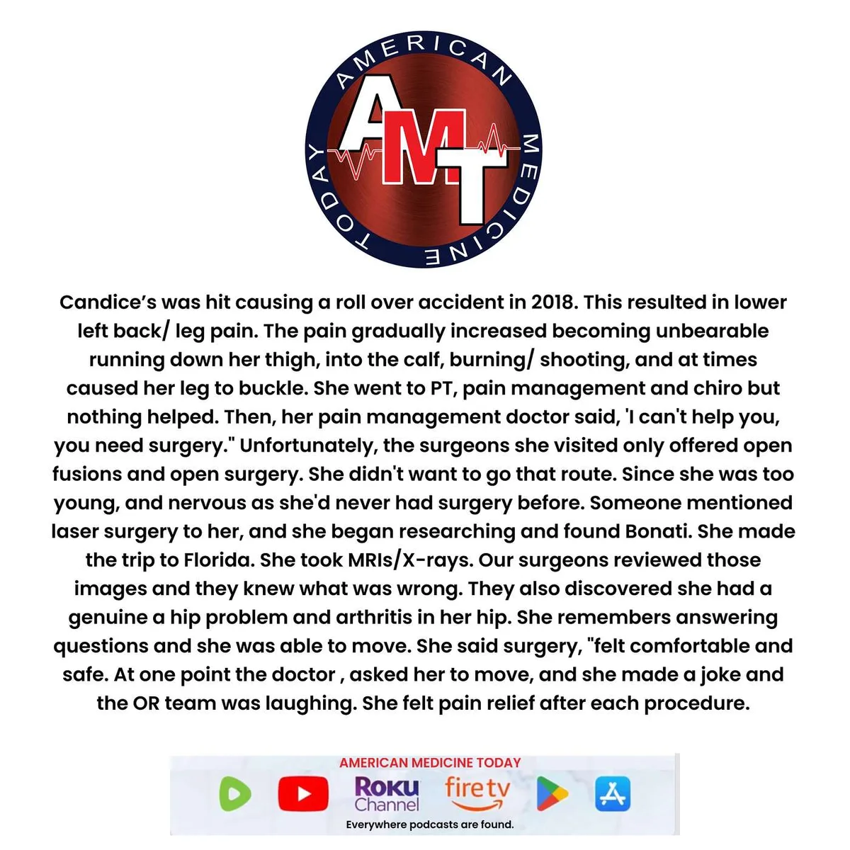 In this episode of American Medicine Today, listeners are introduced to Candice Similton, whose life was turned upside down following a car accident in 2018. The incident left her with excruciating pain that affected her lower back and leg, making everyday tasks feel like climbing Everest. Candice shares her journey through physical therapy and pain management, which led her to the brink of surgery.