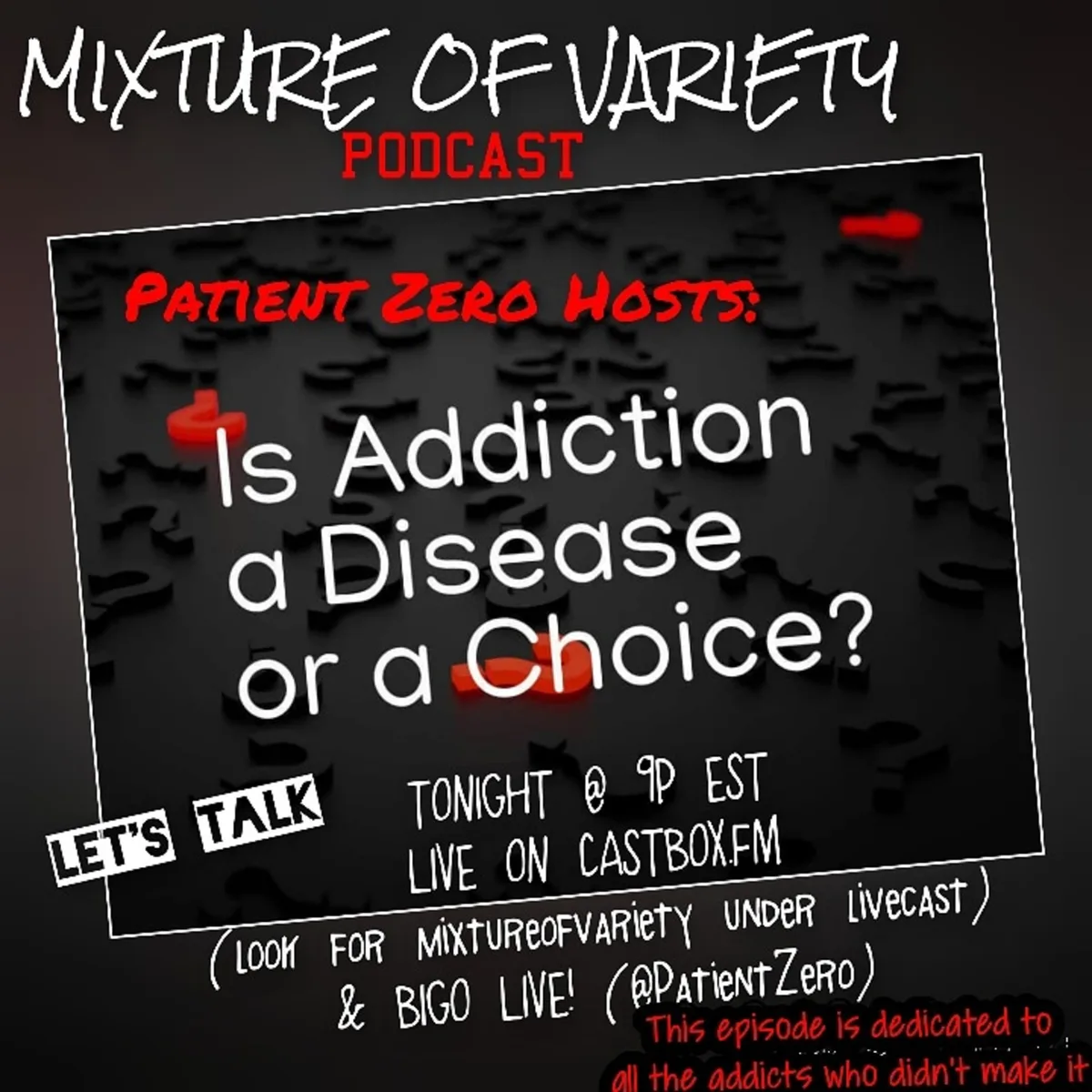 In this deeply moving episode of the Mixture of Variety Podcast, host PatientZero delves into the profound and often painful topic of addiction. Through a raw and honest narrative, he shares personal experiences with addiction and the devastating impact it has on families and loved ones. The episode begins with a heartfelt reflection on the loss of a loved one to addiction, highlighting the emotional turmoil and unresolved feelings that accompany such tragedies.