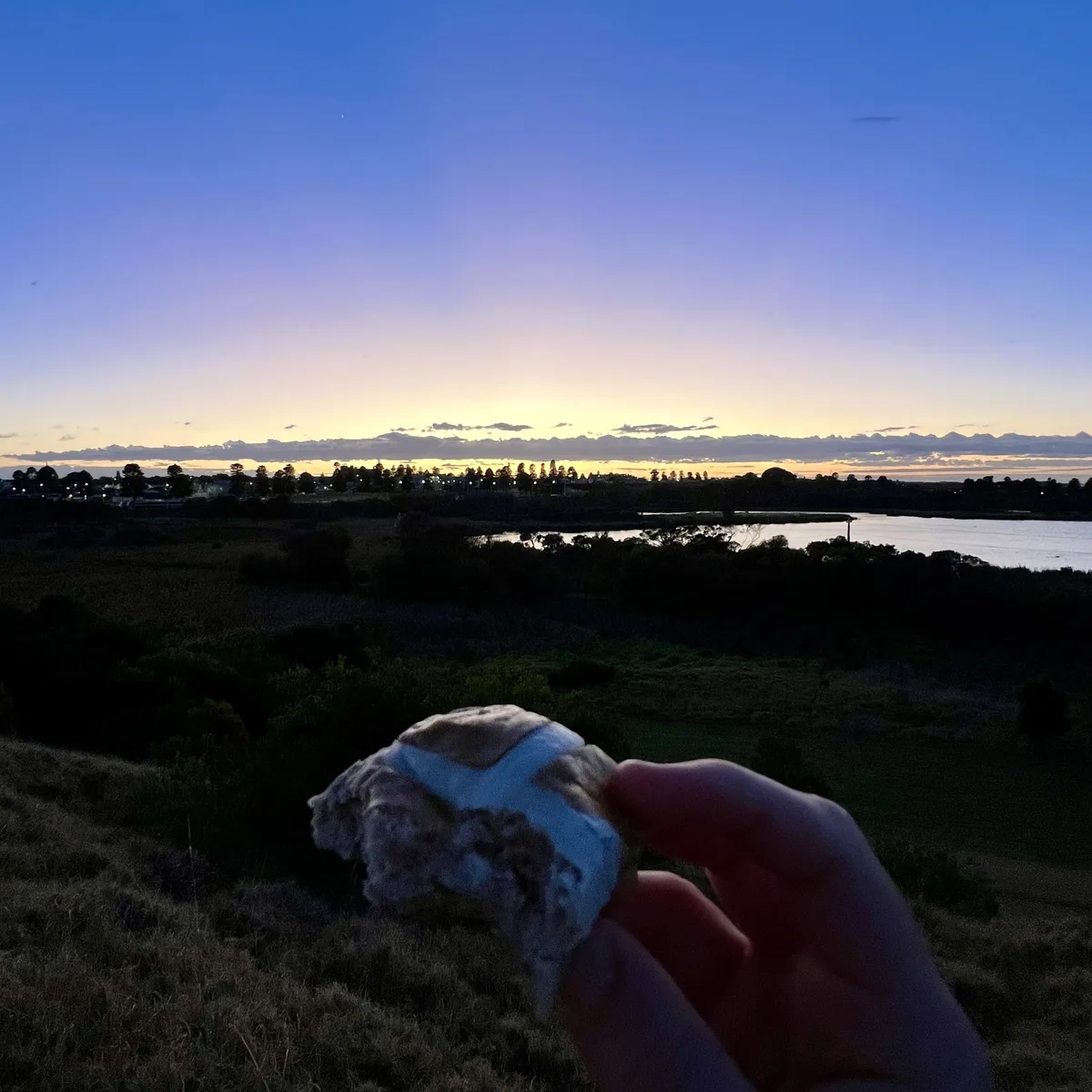 “"Grateful: Watched the Easter Sunday sunrise with a hot cross bun."”