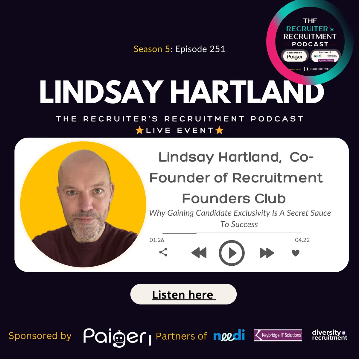 In this engaging episode of The Recruiter's Recruitment Podcast, Lindsay Hartland from Hanison Green and Recruitment Founders Club takes the stage at a live event in Birmingham. Lindsay shares his fascinating journey of entering the US med-tech market, specifically neuromodulation, without prior knowledge. He emphasises the importance of candidate exclusivity and how it serves as a 'secret sauce' to success in recruitment.