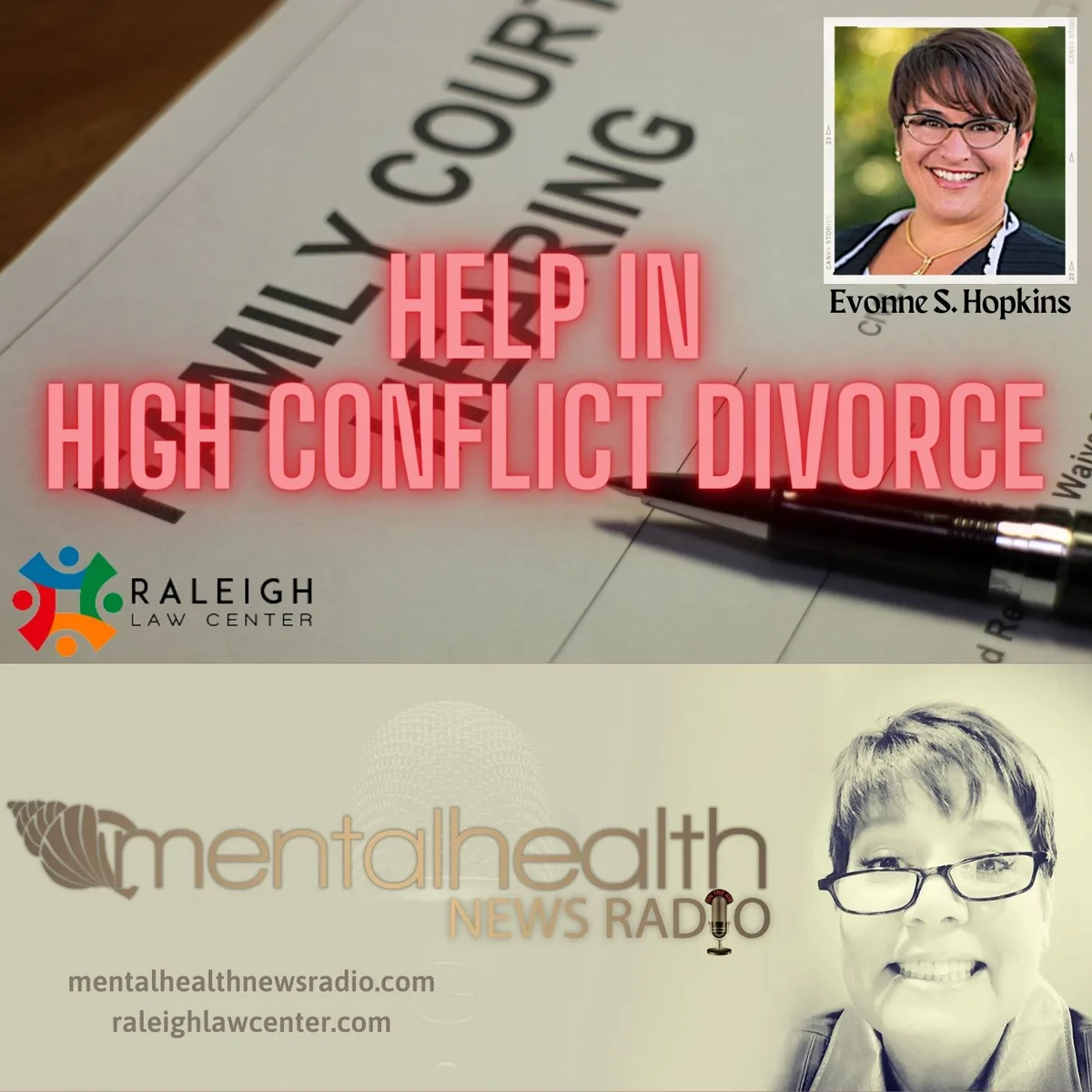 In this episode of Mental Health News Radio, host Kristen Sunanta-Walker is joined by Evonne Hopkins, a North Carolina Board Certified Family Law Specialist, to delve into the complexities of high conflict divorce involving narcissists. Divorce is never an easy process, but when it involves coercive control, gaslighting, and other forms of emotional manipulation, it becomes an intense struggle. Evonne Hopkins shares her expertise in handling such cases, offering insights into the mental health challenges that often arise.