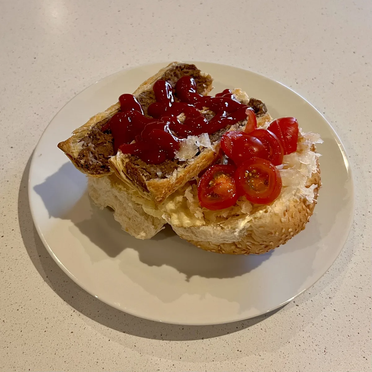 “"Had a sausage roll barm for tea - a buttered barm with a sausage roll, salt and vinegar chips, tomatoes, sauerkraut, and sauce."”